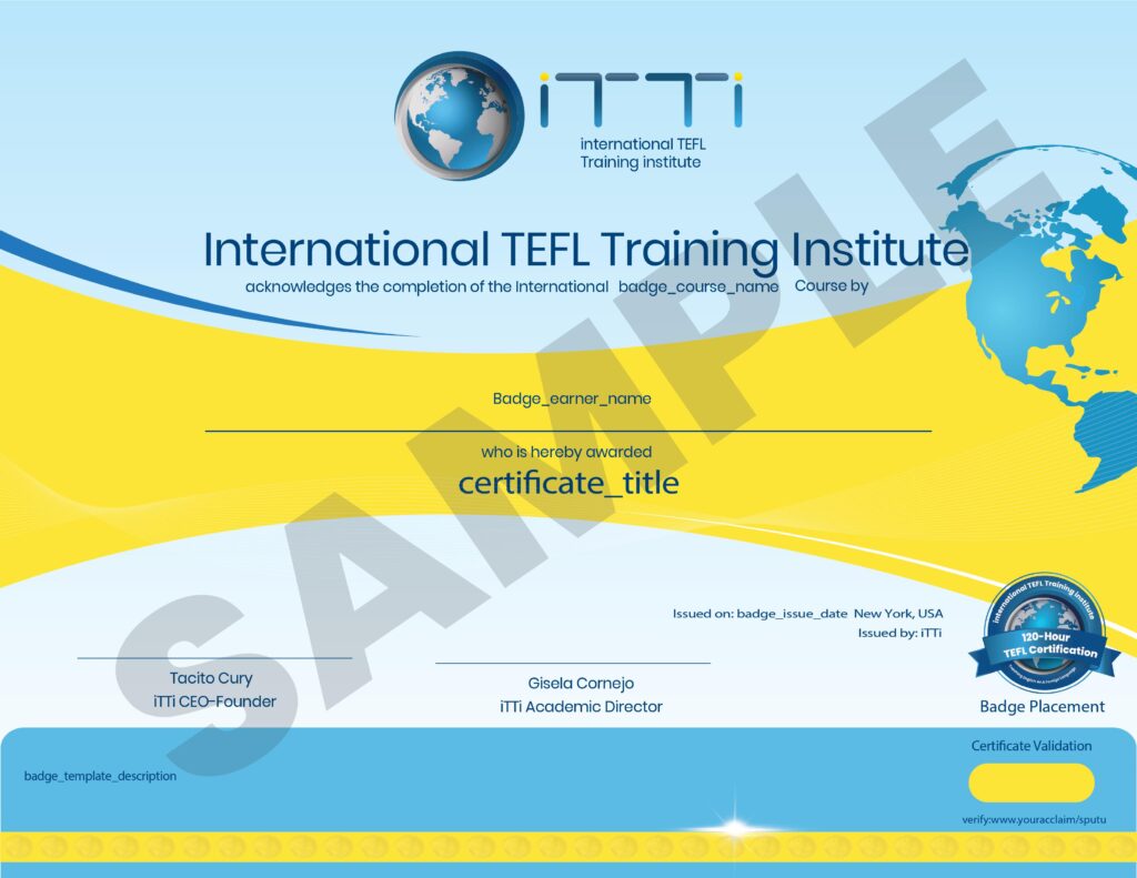 nternational TEFL Training institute is a brand name in the field of teaching English as a foreign language. iTTi is recognized by employers worldwide for the exceptional teaching quality of our graduates. Our TEFL training courses meet or exceed international standards in teacher training and are accredited by authorized bodies in the field: All iTTi-in-class or blended TEFL certification programs are externally monitored and approved at a Level 5 Ofqual (British Government) accreditation by TQUK (authorized accreditor of Ofqual). All iTTi-authorized partner-operated classes are externally monitored and meet or exceed all accreditation standards. All iTTi instructors possess advanced degrees & training in the field of TEFL. They become iTTi-certified after a 25-hour preparation course and must renew their certification after two years. All TEFL certification courses include a teaching practicum with actual EFL/ESL students.